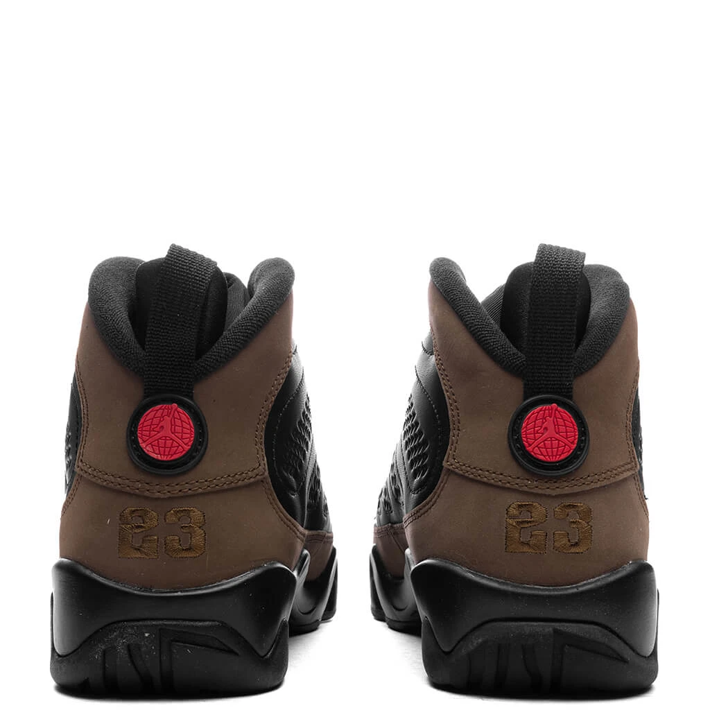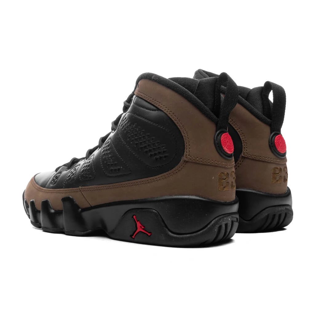 The Air Jordan 9 Retro (GS) in Black/True Red/Light Olive combines a leather and suede upper for durability and a premium look. Featuring a lace-up closure for a secure fit, the sneaker also highlights signature Jordan branding on the outsole and tongue. For comfort, the Air-Sole unit in the heel provides responsive cushioning, while the rubber outsole with a multidirectional traction pattern ensures grip on various surfaces. A neoprene inner sleeve adds to the snug, comfortable fit.